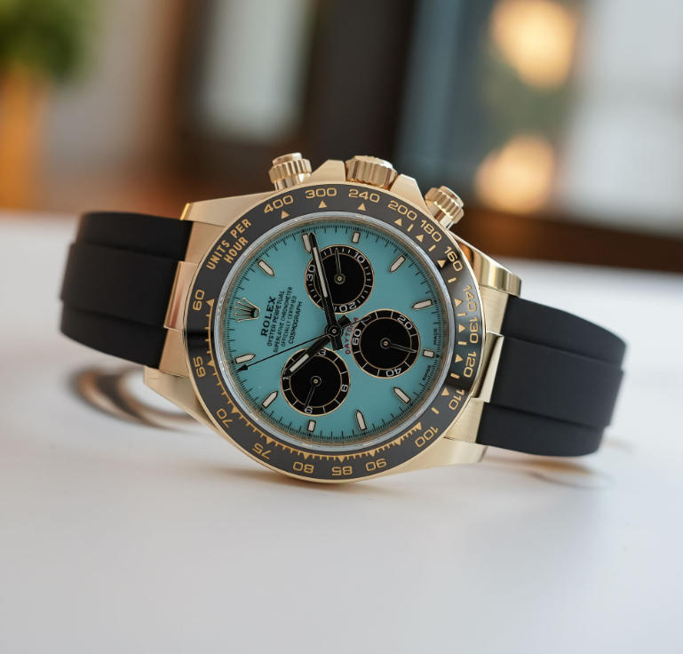 This year, even though 1:1 fake Rolex watches has been fairly discreet about it, was a great year for the Daytona, seeing the introduction of not one but 8 new references in total, including meteorite dials, a new white gold with blue dial, new chocolate brown editions and the John Mayer MKII with two-tone green dial. The only one that was openly advertised was the one we’ll be looking at today, the now so-called Alcaraz, because tennis player Carlos Alcaraz, winner of Roland Garros 2025, wore it during the prize ceremony. And I can vividly remember my initial reaction when seeing the official images of this new turquoise lacquered, yellow gold Daytona during the night of April 1st. And no, I am not going to publish the words that came out of my mouth at that moment. We still have certain rules in our editorial policy.